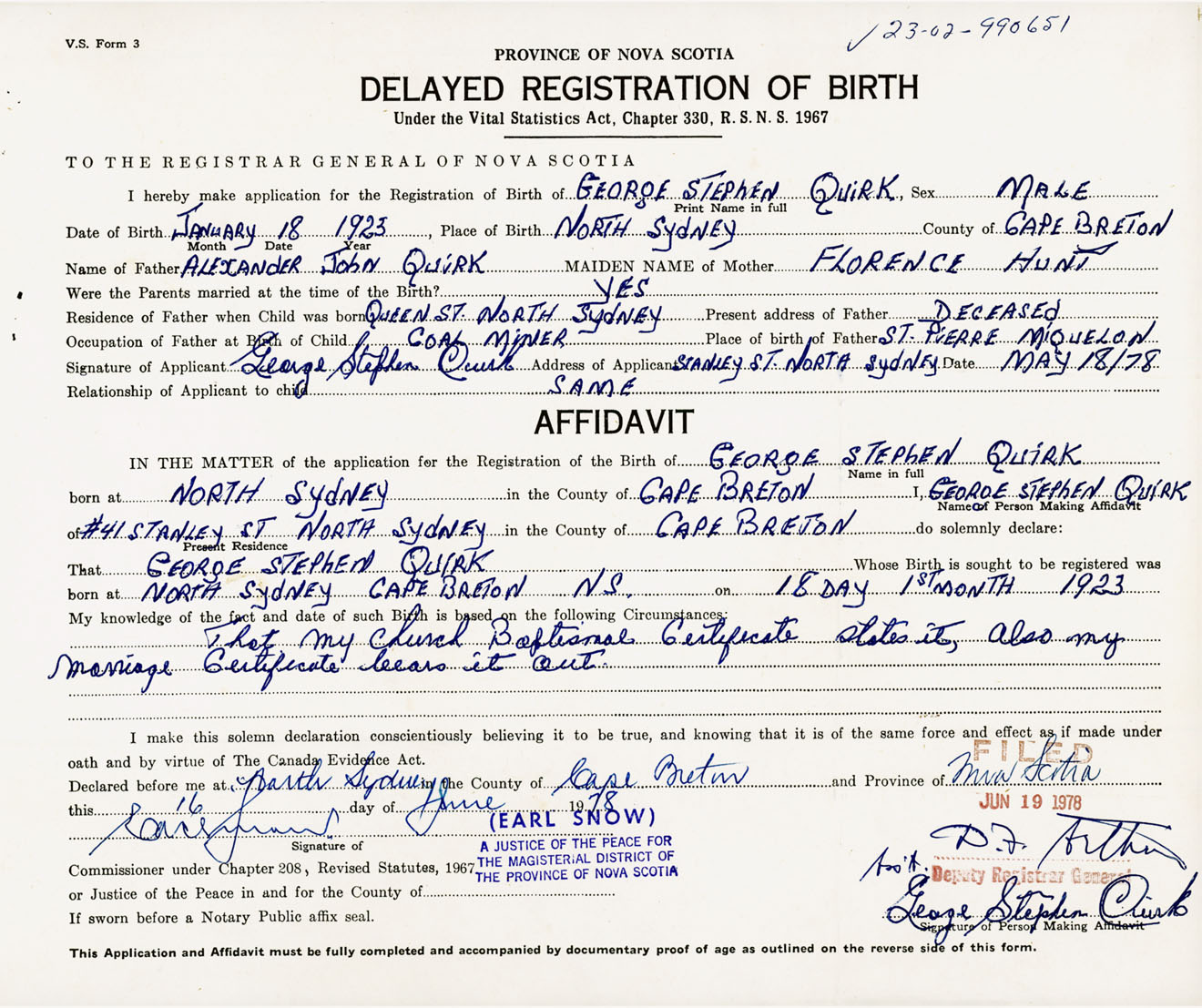 Signature of Applicant George Stephen Quirk Address of Applicant Stanley Street, North Sydney, Cape Breton Co., NS Date 18 May 1978