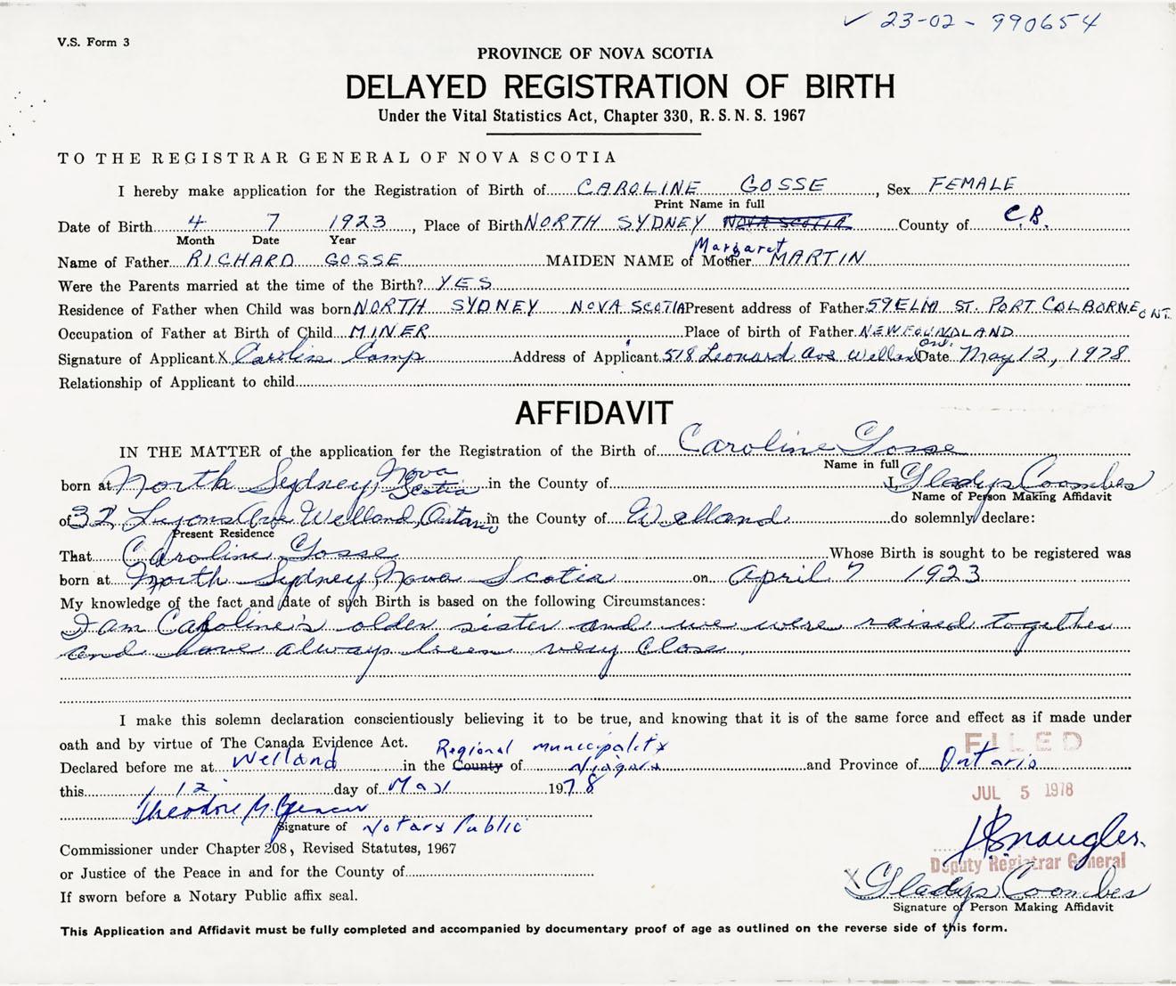 Signature of Applicant Caroline Camp Address of Applicant 518 Leonard Avenue, Welland, Ontario Date 12 May 1978