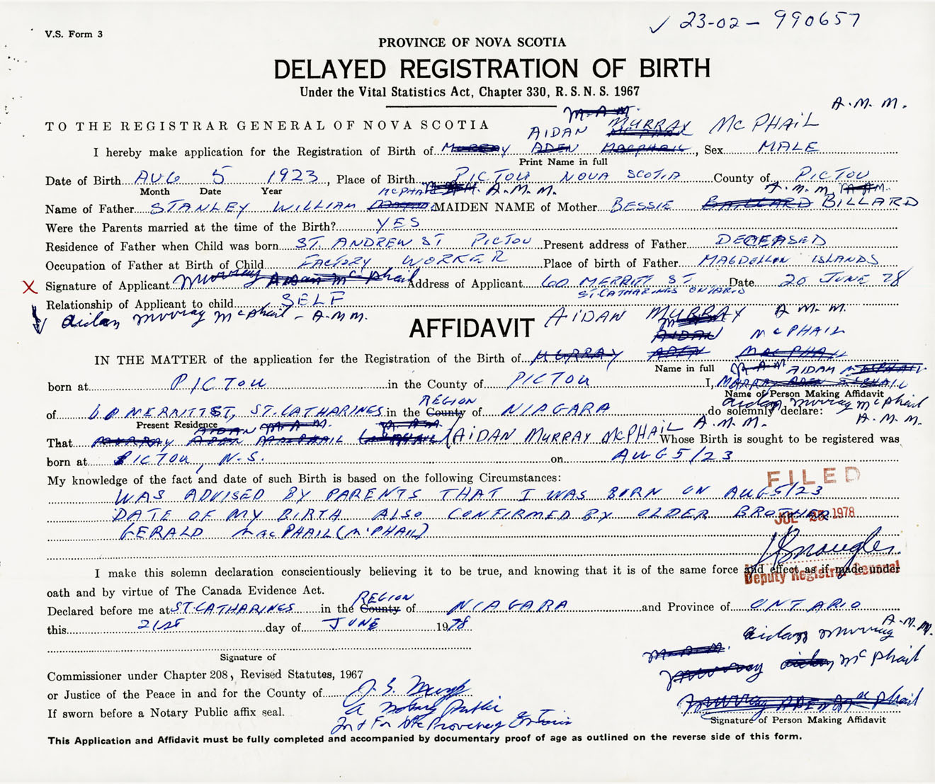 Was advised by parents that I was born on August 5, 1923. Date of my birth also confirmed by older brother Gerald MacPhail.