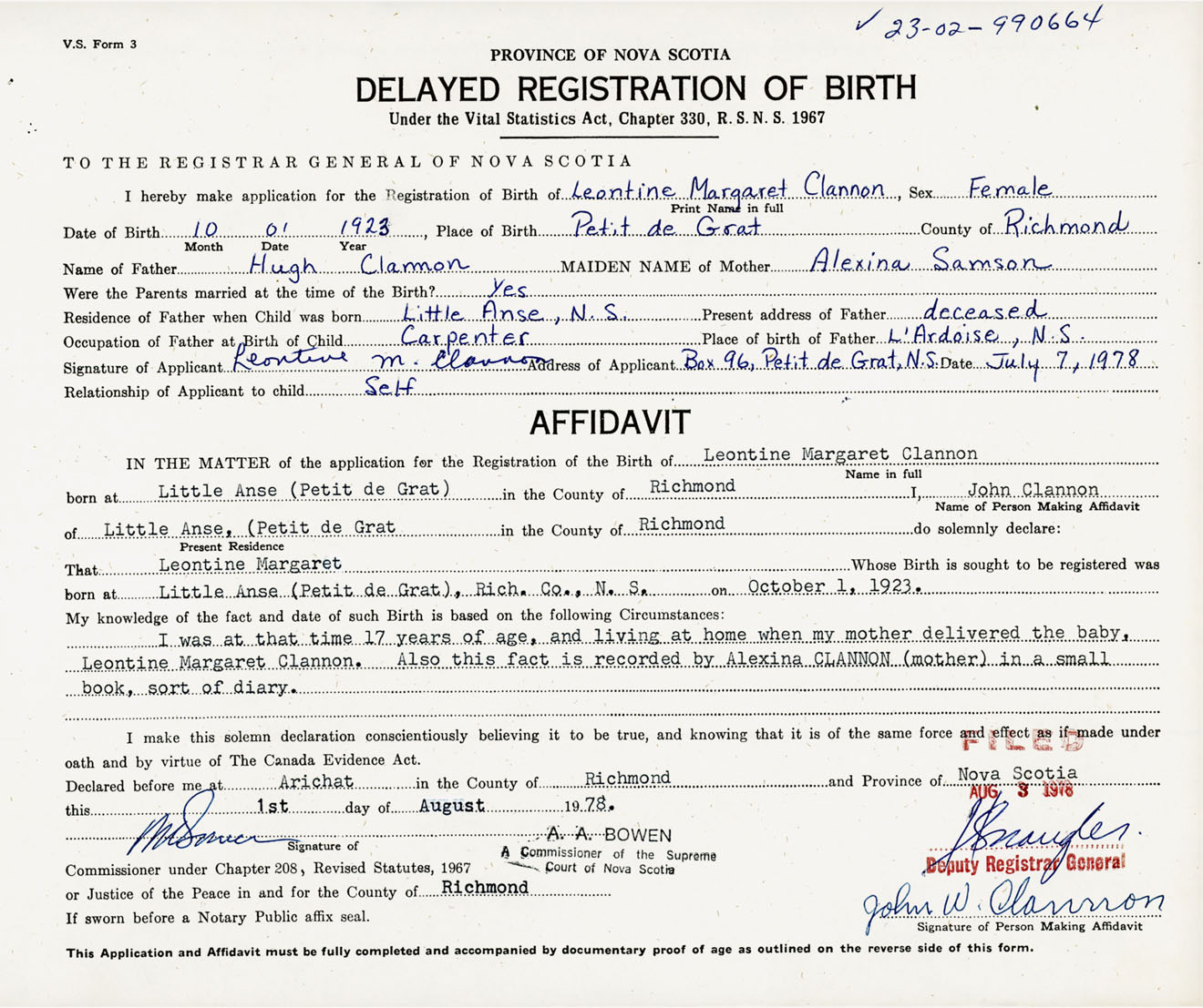 Signature of Applicant Leontine M. Clannon Address of Applicant Box 96, Petit de Grat, Richmond Co., NS Date 7 July 1978