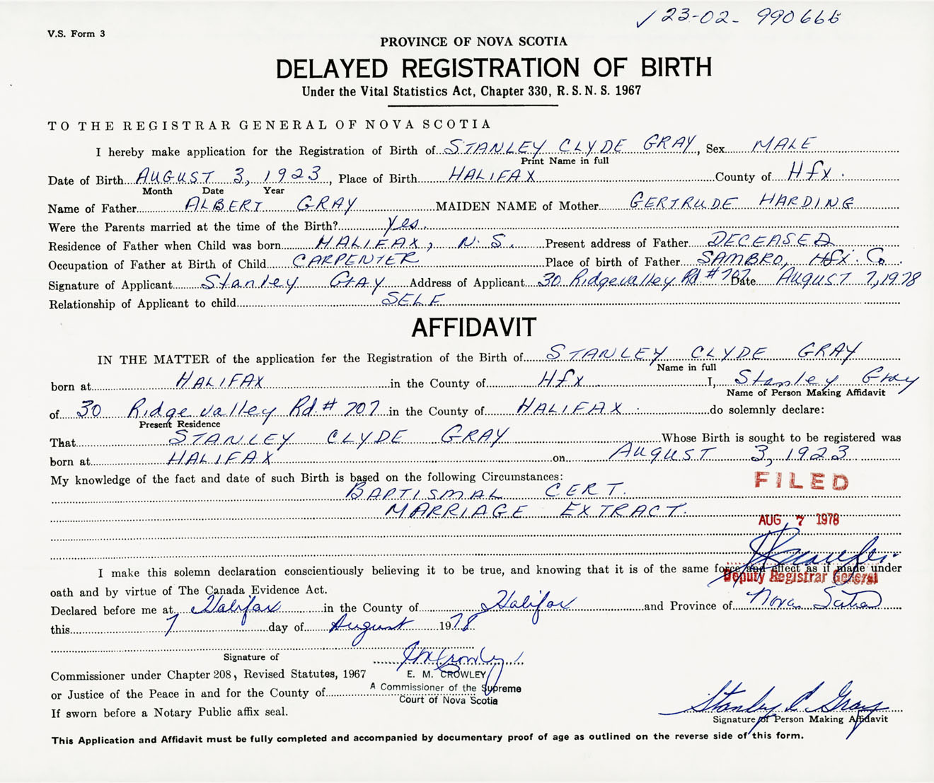 Signature of Applicant Stanley Gray Address of Applicant 30 Ridgevalley Road, Apr 707, Halifax, NS Date 7 August 1978