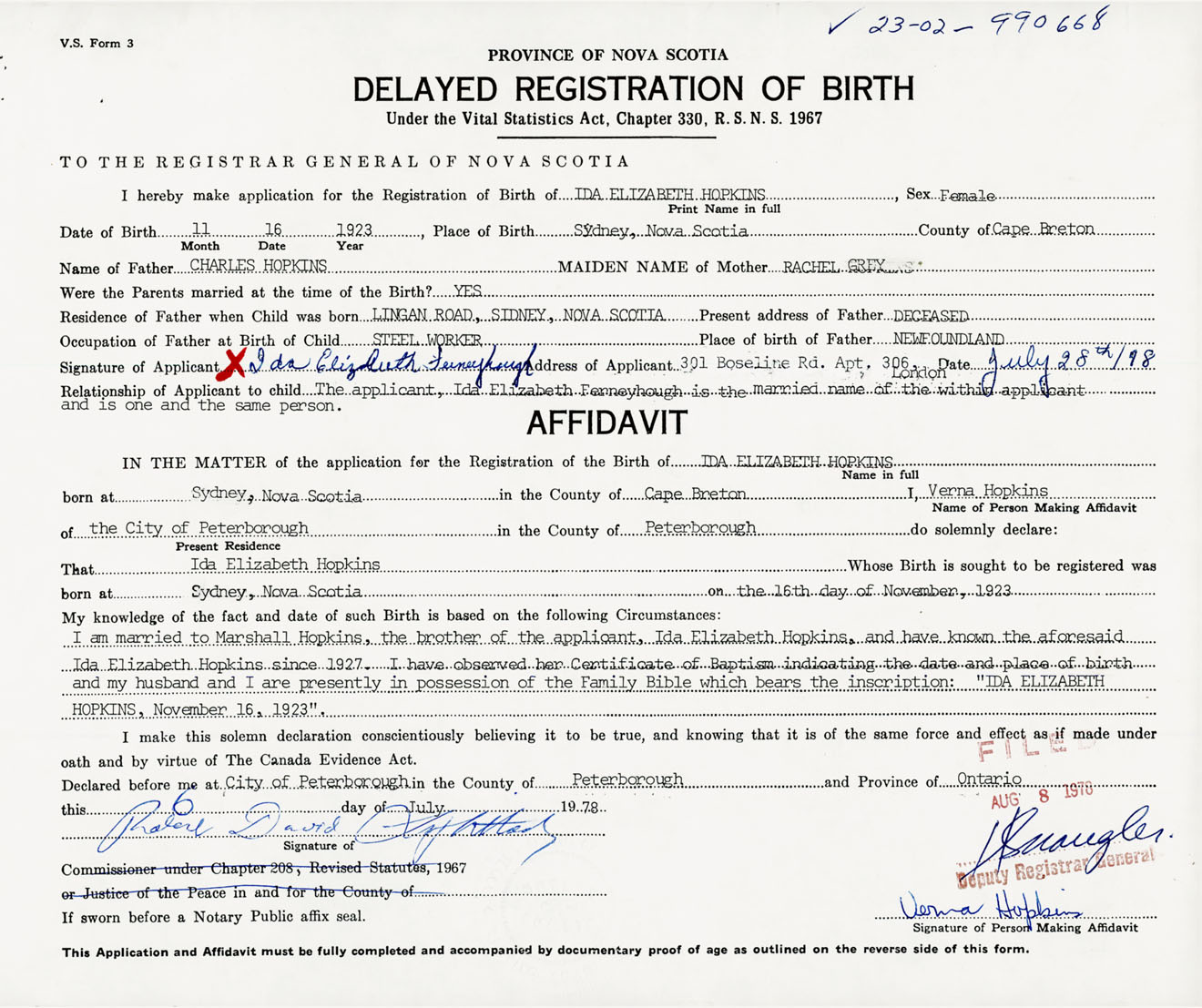 Signature of Applicant Ida Elizabeth Ferneyhough Address of Applicant 301 Baseline Road, Apt #306, London, Ontario Date 28 July 1978