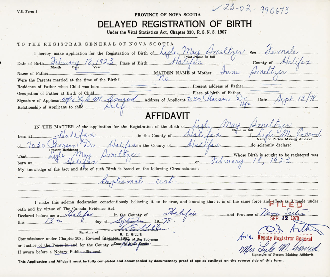 Signature of Applicant Mrs. Lyle M. Conrod Address of Applicant 7030 Pearson Drive, Halifax, NS Date 13 September 1978