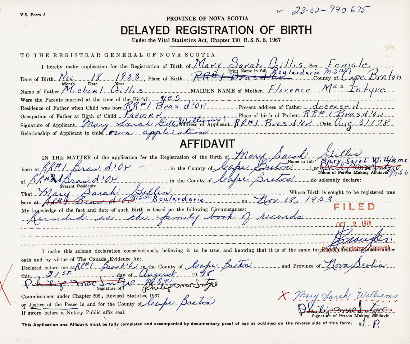 Signature of Applicant Mary Sarah Gillis Williams Address of Applicant RR #1, Bras d'Or, Cape Breton Co., NS Date 31 August 1978