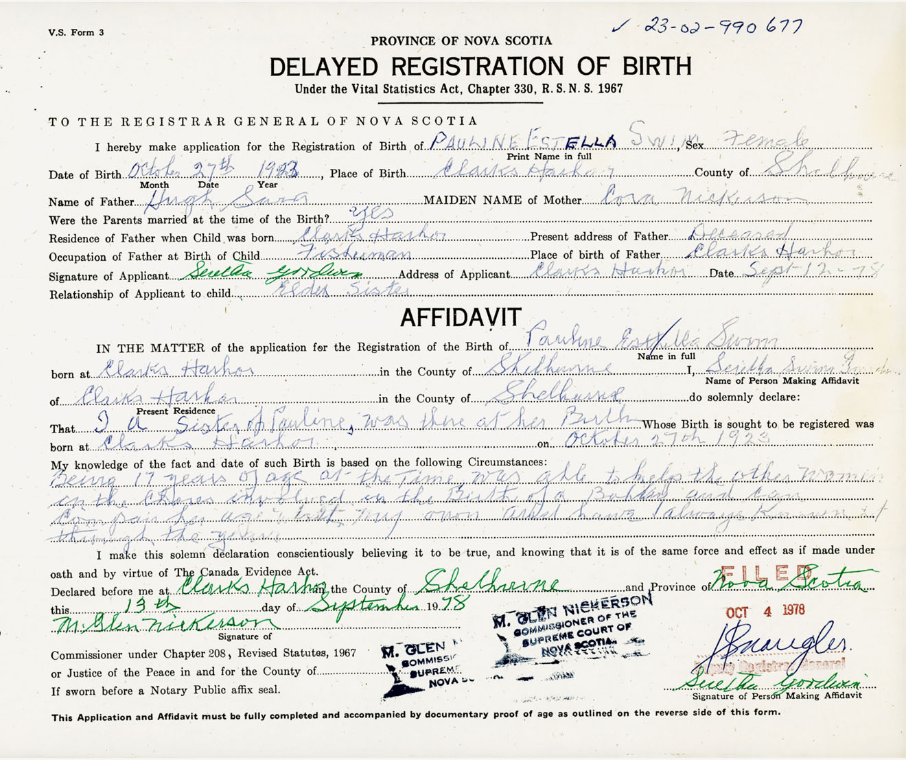 Signature of Applicant Serilla Goodwin Address of Applicant Clarks Harbour, Shelburne Co., NS Date 12 September 1978