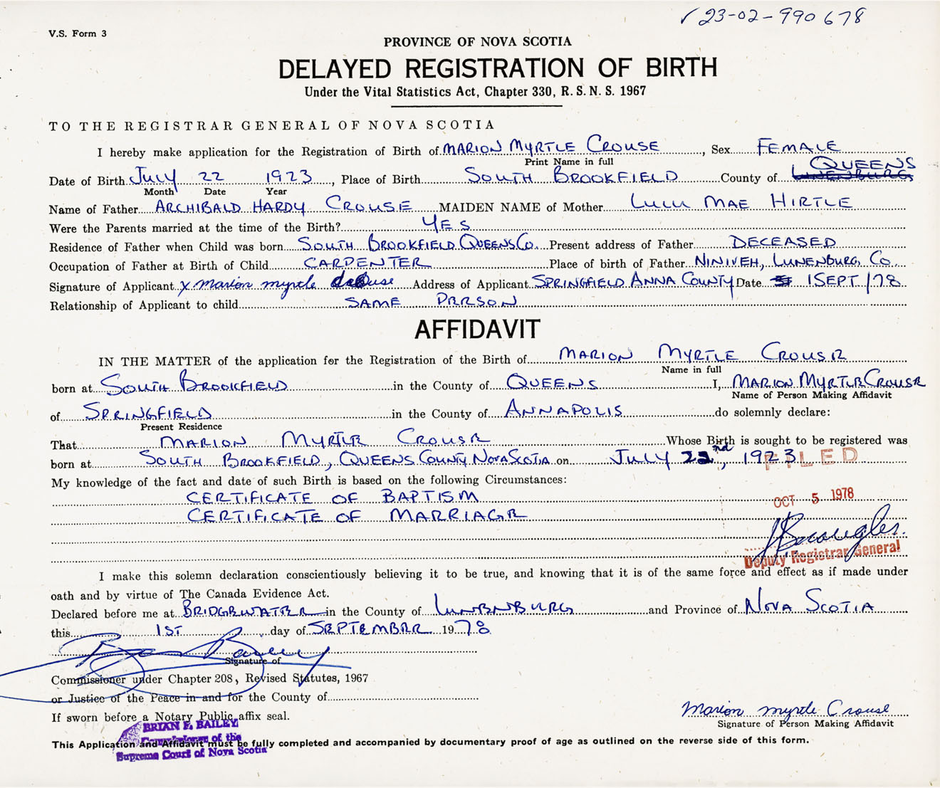 Signature of Applicant Marion Myrtle Crouse Address of Applicant Springfield, Annapolis Co., NS Date 1 September 1978