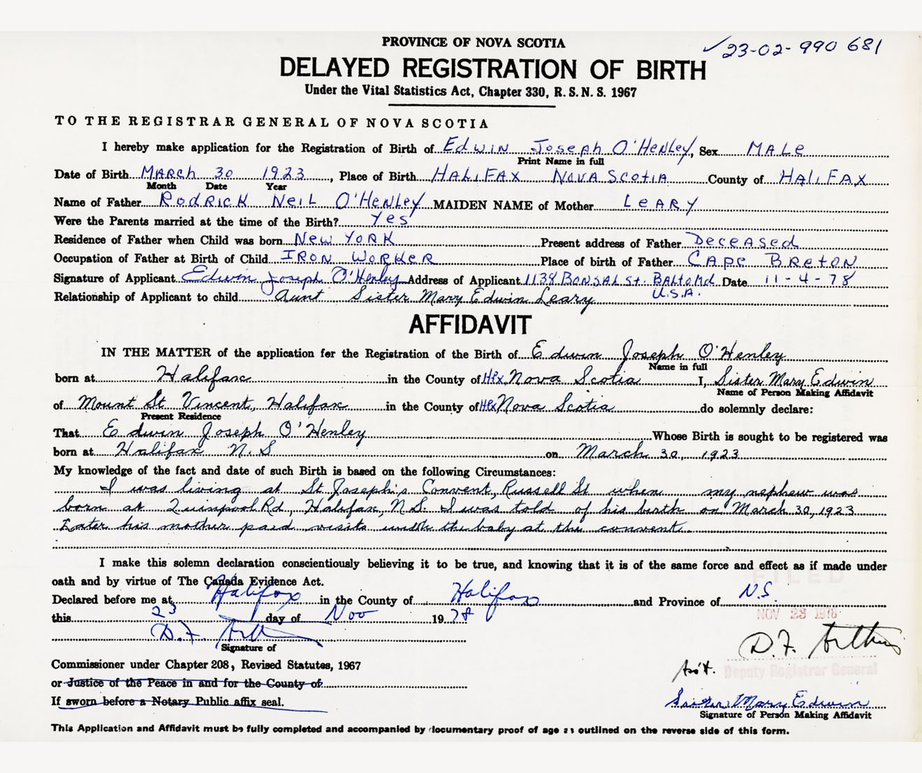 I hereby make application for the Registration of Birth of Edwin JosephO'Henley Sex Male