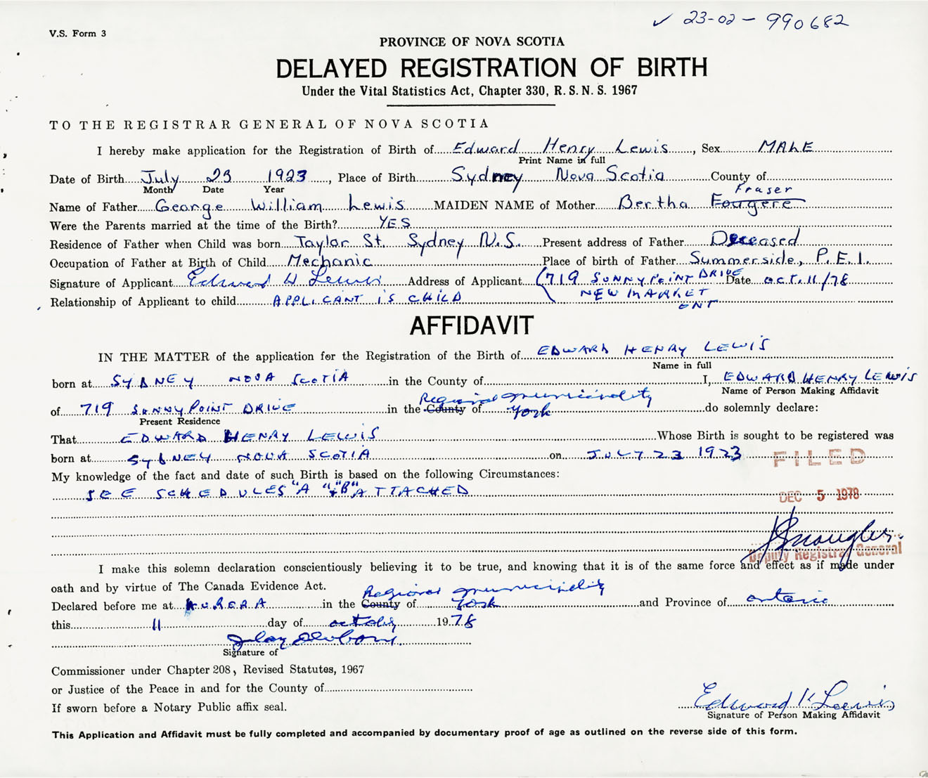 Signature of Applicant Edward H. Lewis Address of Applicant 719 Sunny Point Drive, Newmarket, Ontario Date 11 October 1978