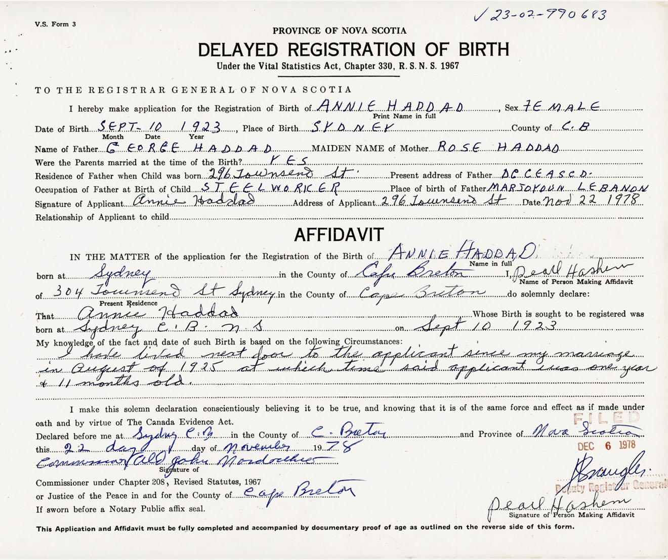 Signature of Applicant Annie Haddad Address of Applicant 296 Townsend Street, Sydney, Cape Breton Co., NS Date 22 November 1978