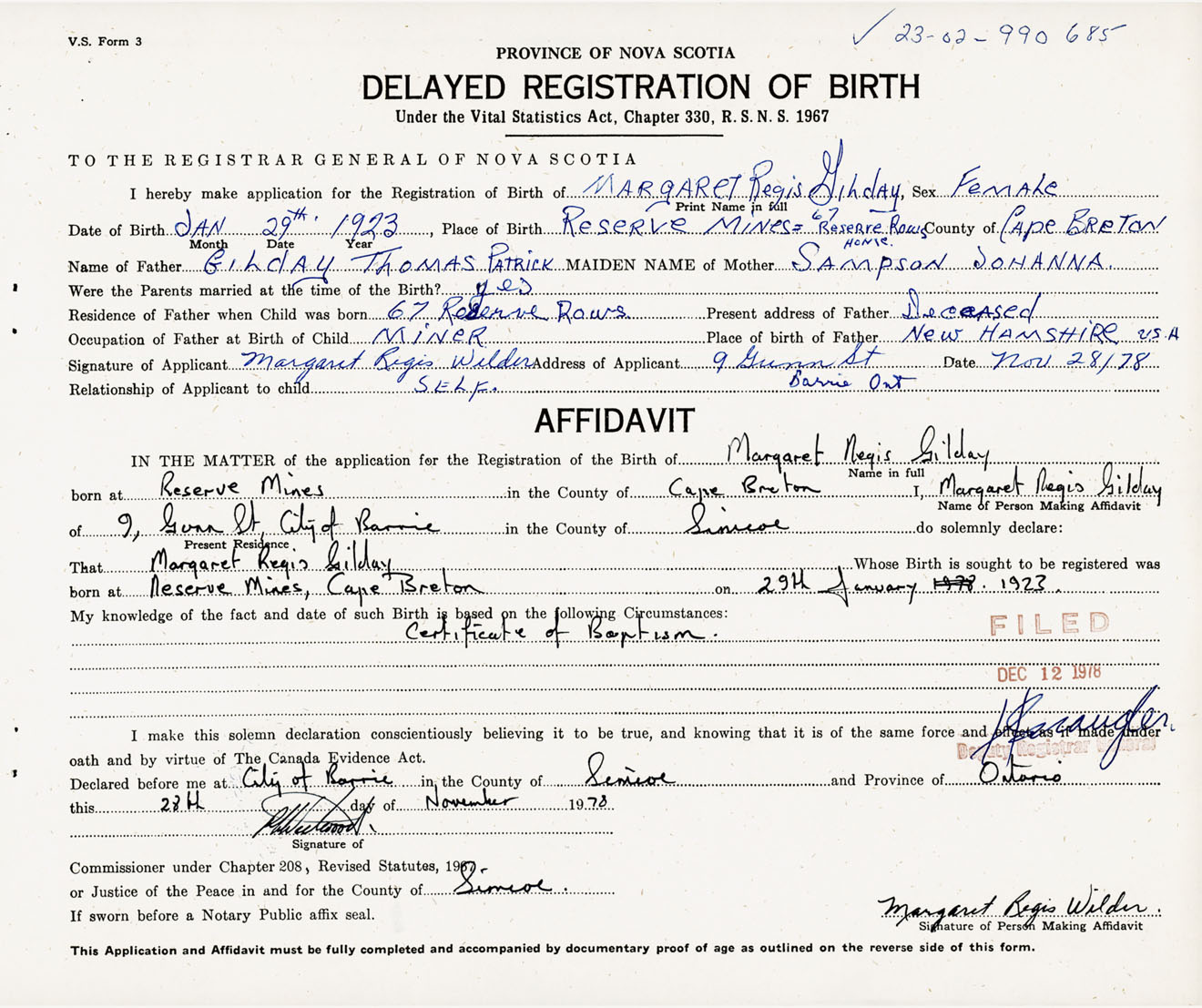 Signature of Applicant Margaret Regis Wilder Address of Applicant 9 Gunn Street, Barrie, Ontario Date 28 November 1978