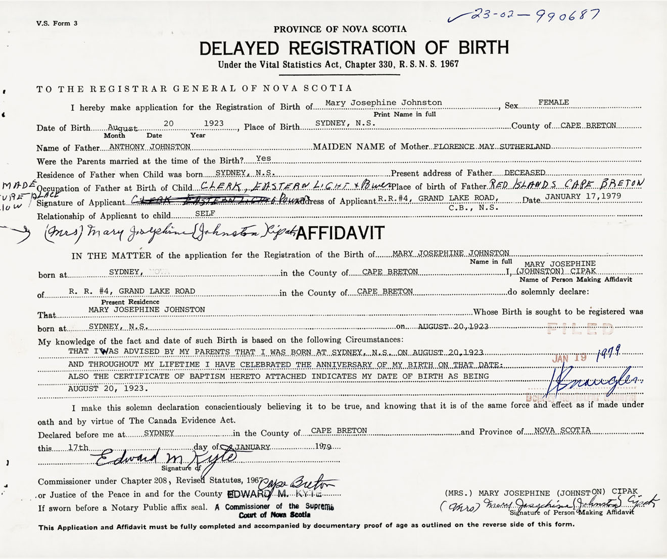 That I was advised by my parents that I was born at Sydney, NS on August 20, 1923 and throughout my lifetime I have celebrated the anniversary of my birth on that date. Also, the certificate of baptism hereto attached indicates my date of birth as being August 20, 1923.