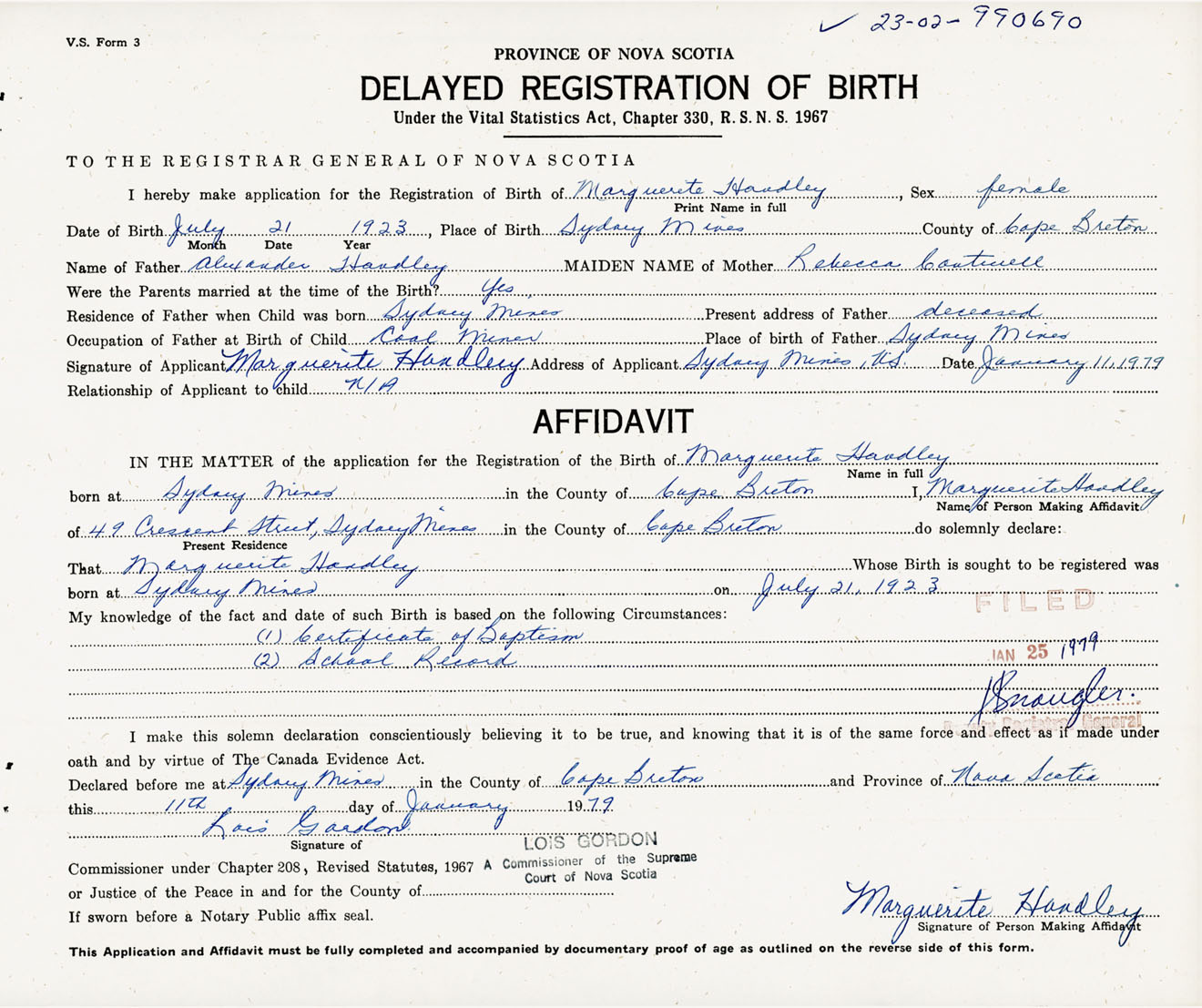 Signature of Applicant Marguerite Handley Address of Applicant Sydney Mines, Cape Breton Co., NS Date 11 January 1979