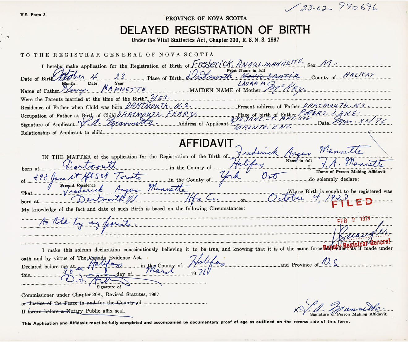 I hereby make application for the Registration of Birth of Frederick AngusMannette Sex Male