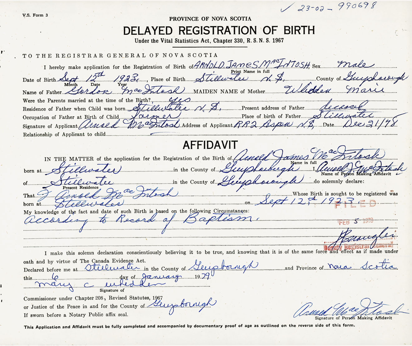 Signature of Applicant Arnold MacIntosh Address of Applicant RR #2, Aspen, Guysborough Co., NS Date 21 December 1978