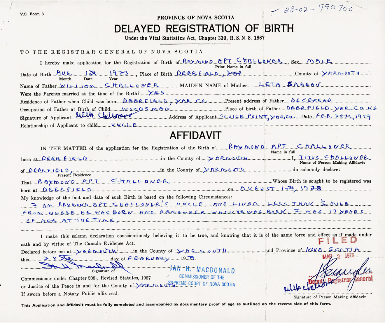 Signature of Applicant Titus Challoner Address of Applicant Sluice Point, Yarmouth Co., NS Date 28 February 1979