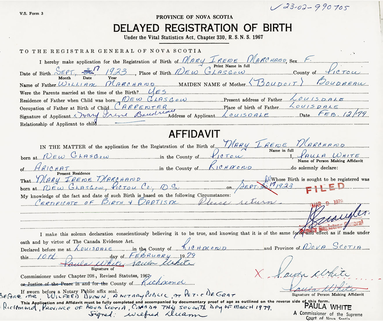 Signature of Applicant Mary Irene Boudreau Address of Applicant Louisdale, Richmond Co., NS Date 12 February 1979