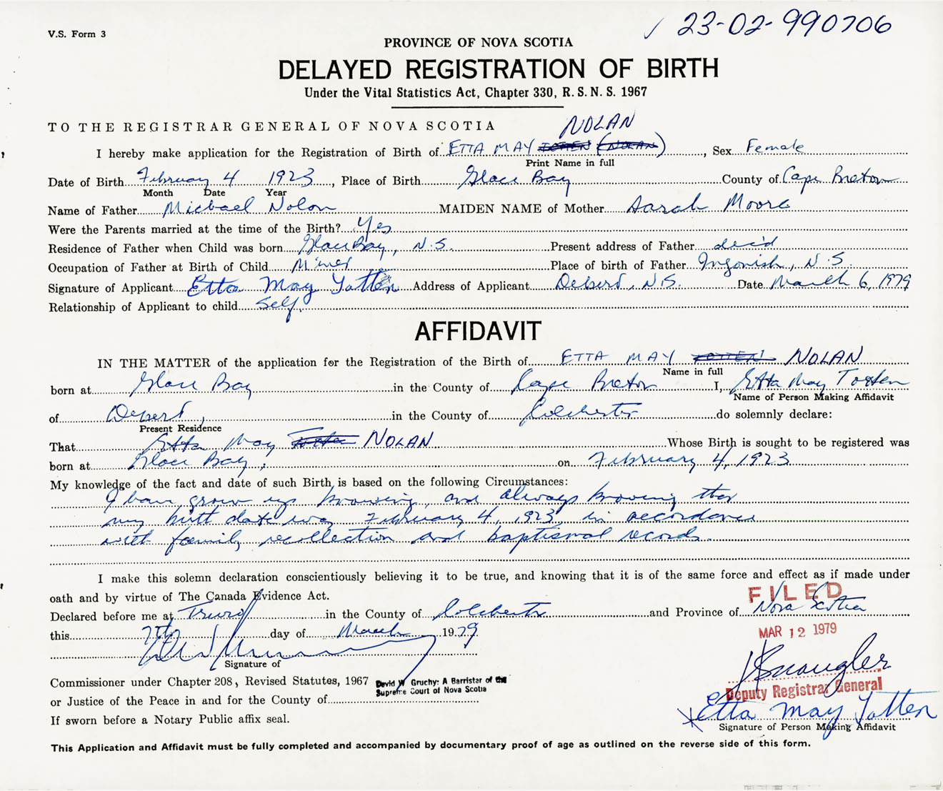 Signature of Applicant Etta May Totten Address of Applicant Debert, Colchester Co., NS Date 6 March 1979