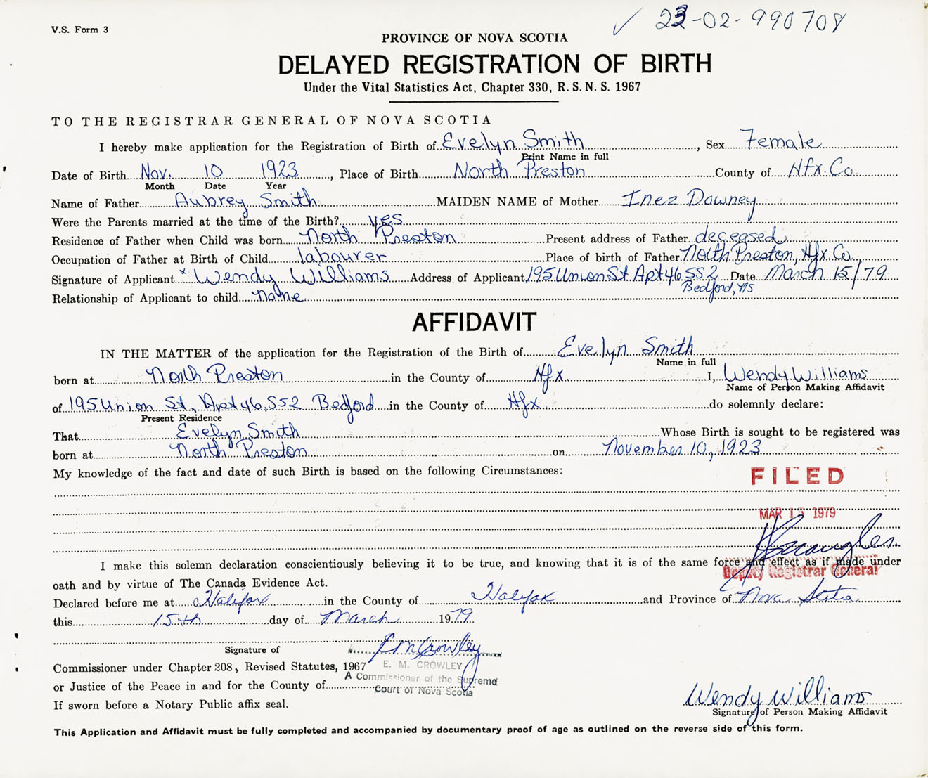 I hereby make application for the Registration of Birth of EvelynSmith Sex Female