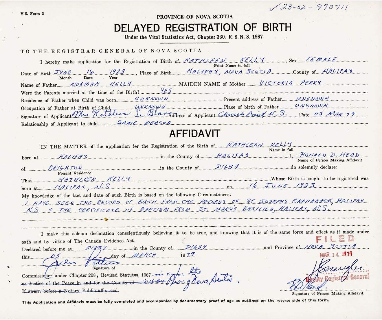 I have seen the record of birth from the records of St. Josephs Orphanage, Halifax, NS and the certificate of baptism from St. Mary's Basilica, Halifax, NS