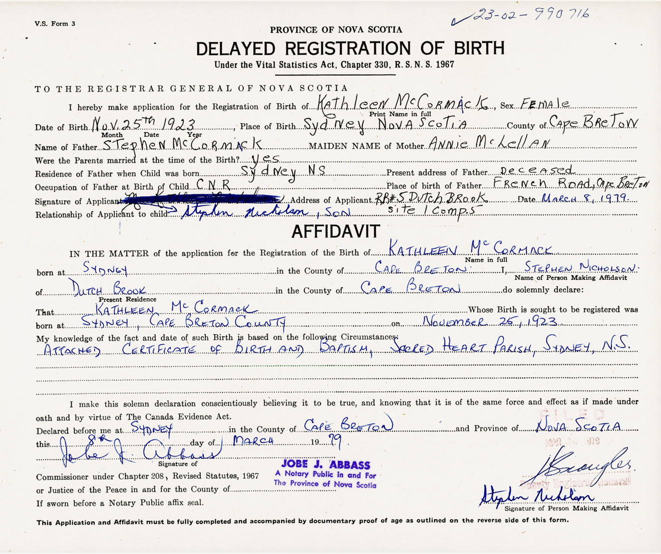 Attached certificate of birth and baptism, Sacred Heart Parish, Sydney, NS