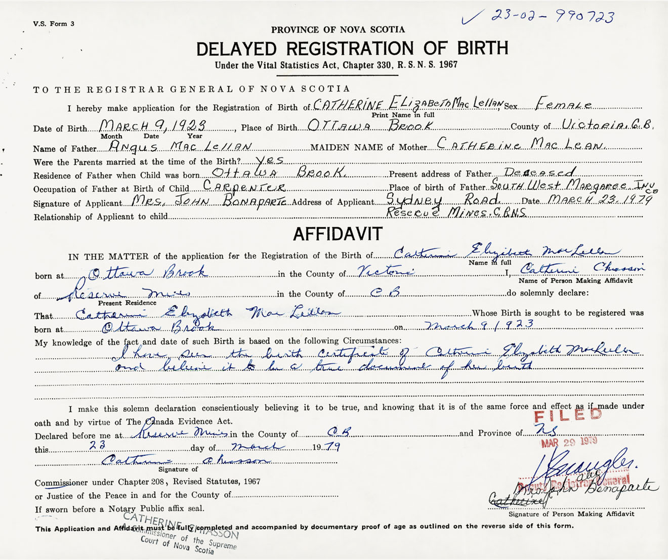 Female Birth Registration: Year: 1923 number: 99000723