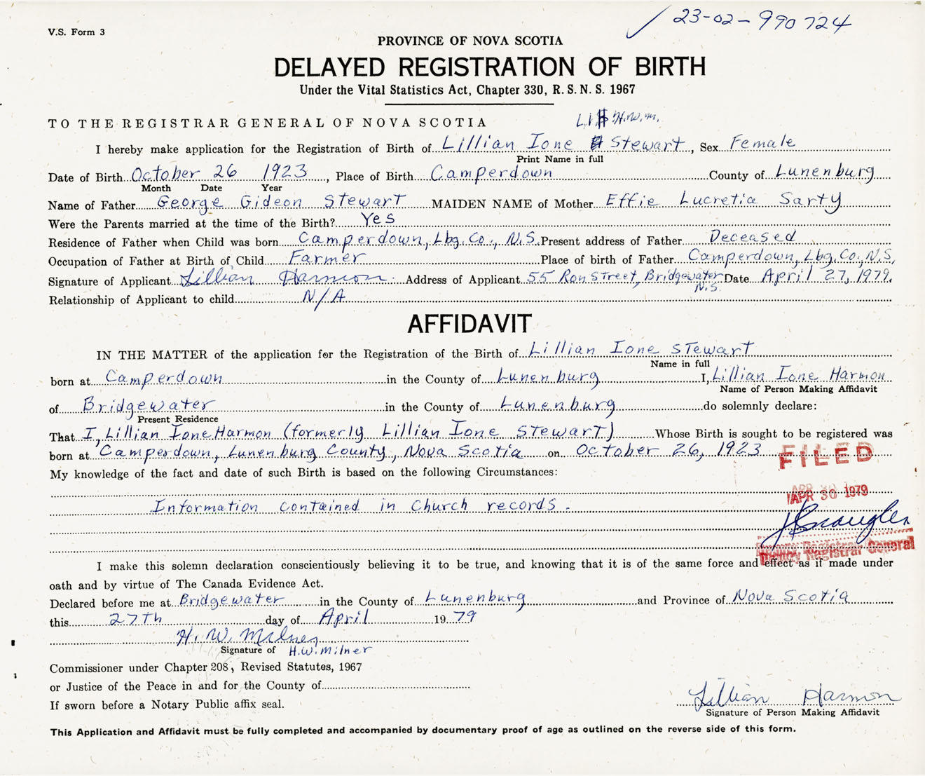 Signature of Applicant Lillian Harmon Address of Applicant 55 Ron Street, Bridgewater, Lunenburg Co., NS Date 27 April 1979