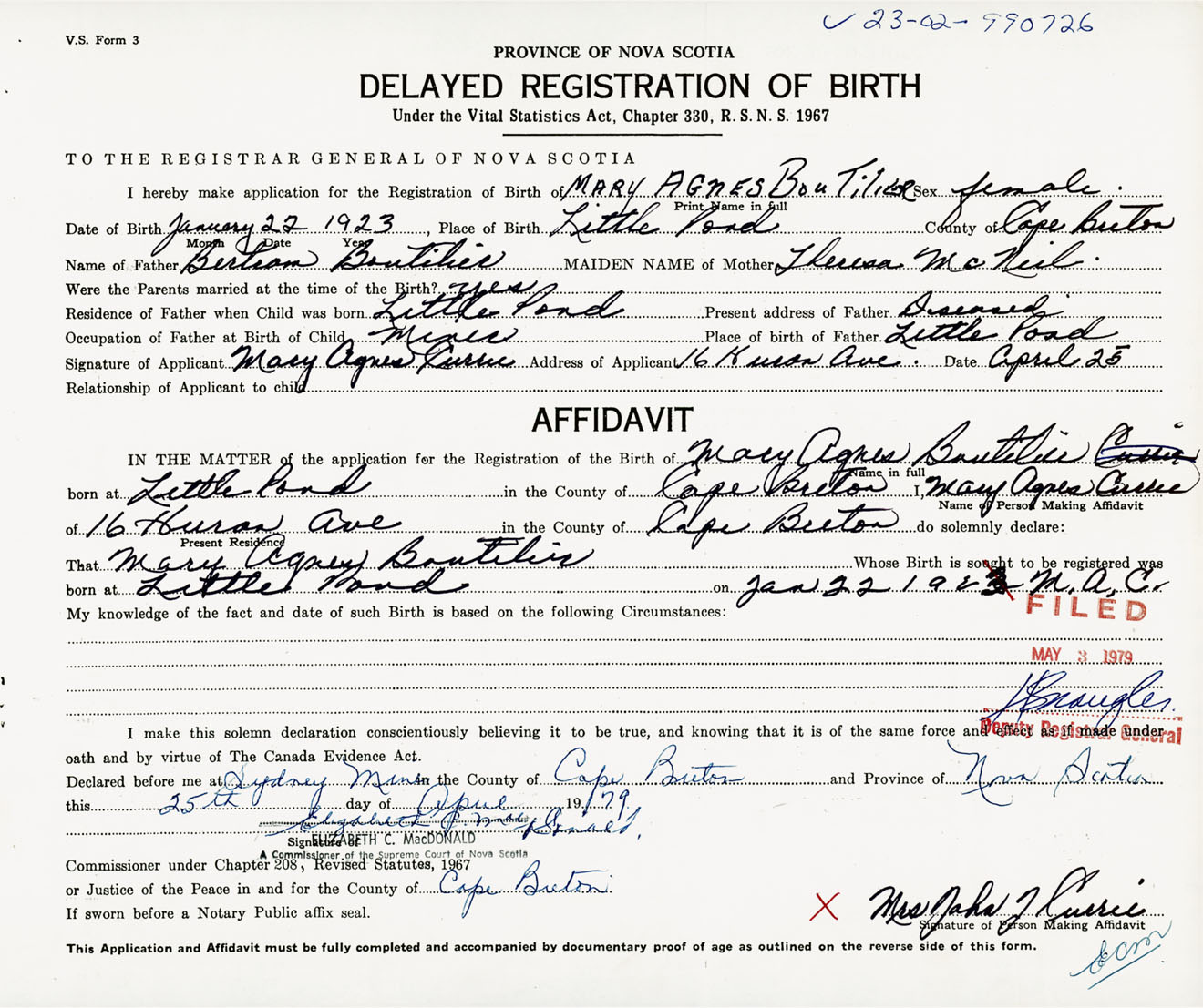 Signature of Applicant Mary Agnes Currie Address of Applicant 16 Huron Avenue, Sudney Mines, Cape Breton Co., NS Date 25 April 1979