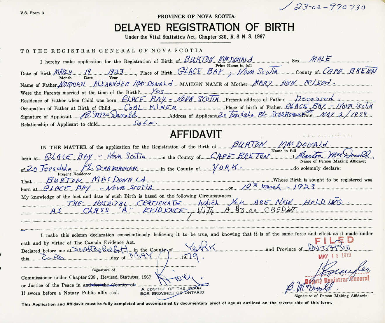 Signature of Applicant B. MacDonald Address of Applicant 20 Teesdale Place, Scarborough, Ontario Date 2 May 1979