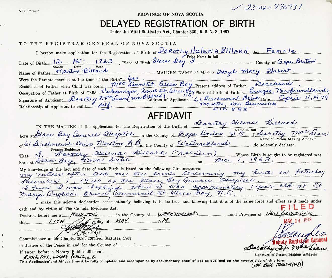 Signature of Applicant Dorothy MacLean Nee Billard Address of Applicant 61 Birchmount Drive, Moncton, New Brunswick, E1C 8E3 Date 11 April 1979