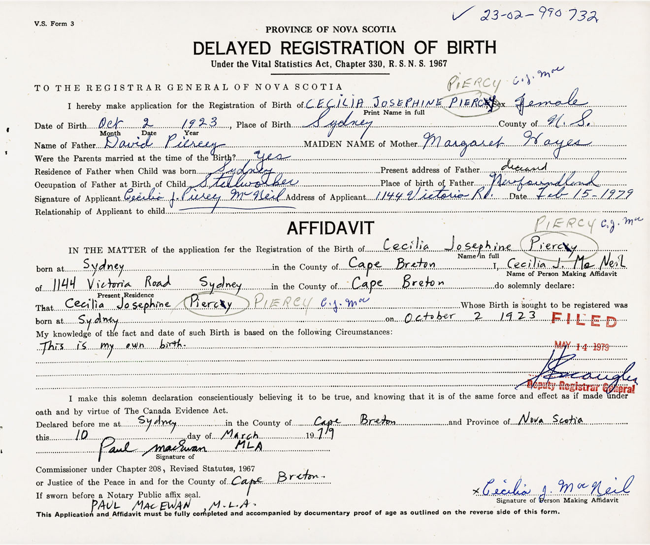 Signature of Applicant Cecilia J. Piercy McNeil Address of Applicant 1144 Victoria Rd., Sydney, Cape Breton Co., NS Date 15 February 1979