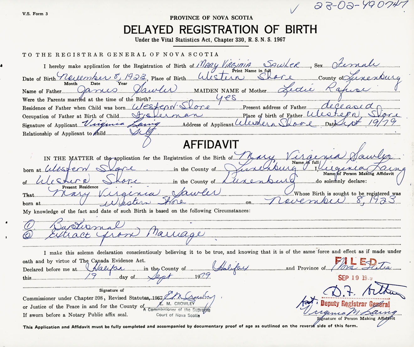 Signature of Applicant Virginia Laing Address of Applicant Western Shore, Lunenburg Co., NS Date 19 September 1979