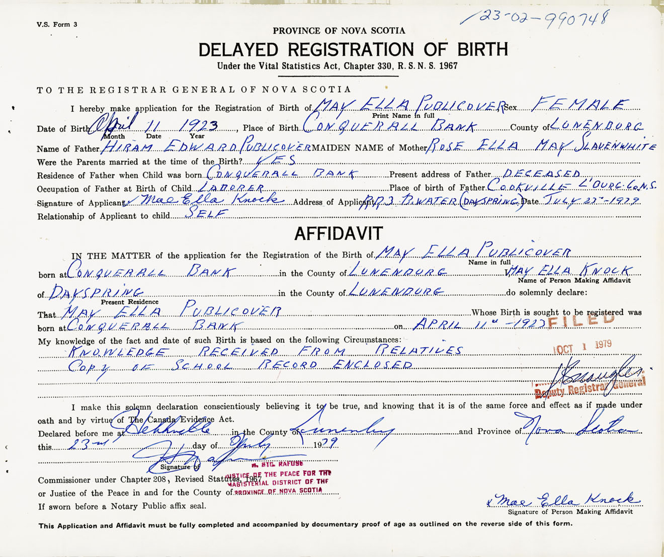 Signature of Applicant Mae Ella Knock Address of Applicant RR #3, Dayspring, Bridgewater, Lunenburg Co., NS Date 25 July 1979