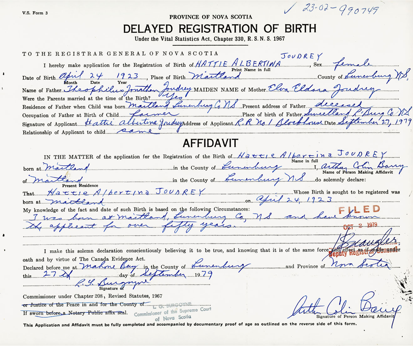 Signature of Applicant Hattie Albertine Joudrey Address of Applicant RR #1, Blockhouse, Lunenburg Co., NS Date 27 September 1979
