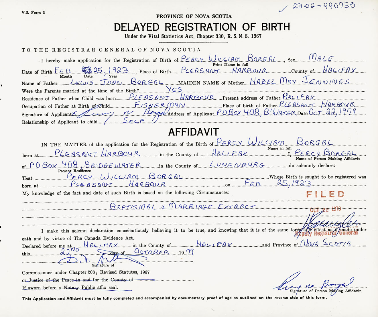 Signature of Applicant Percy W. Borgal Address of Applicant PO Box 408, Bridgewater, Lunenburg Co., NS Date 22 October 1979