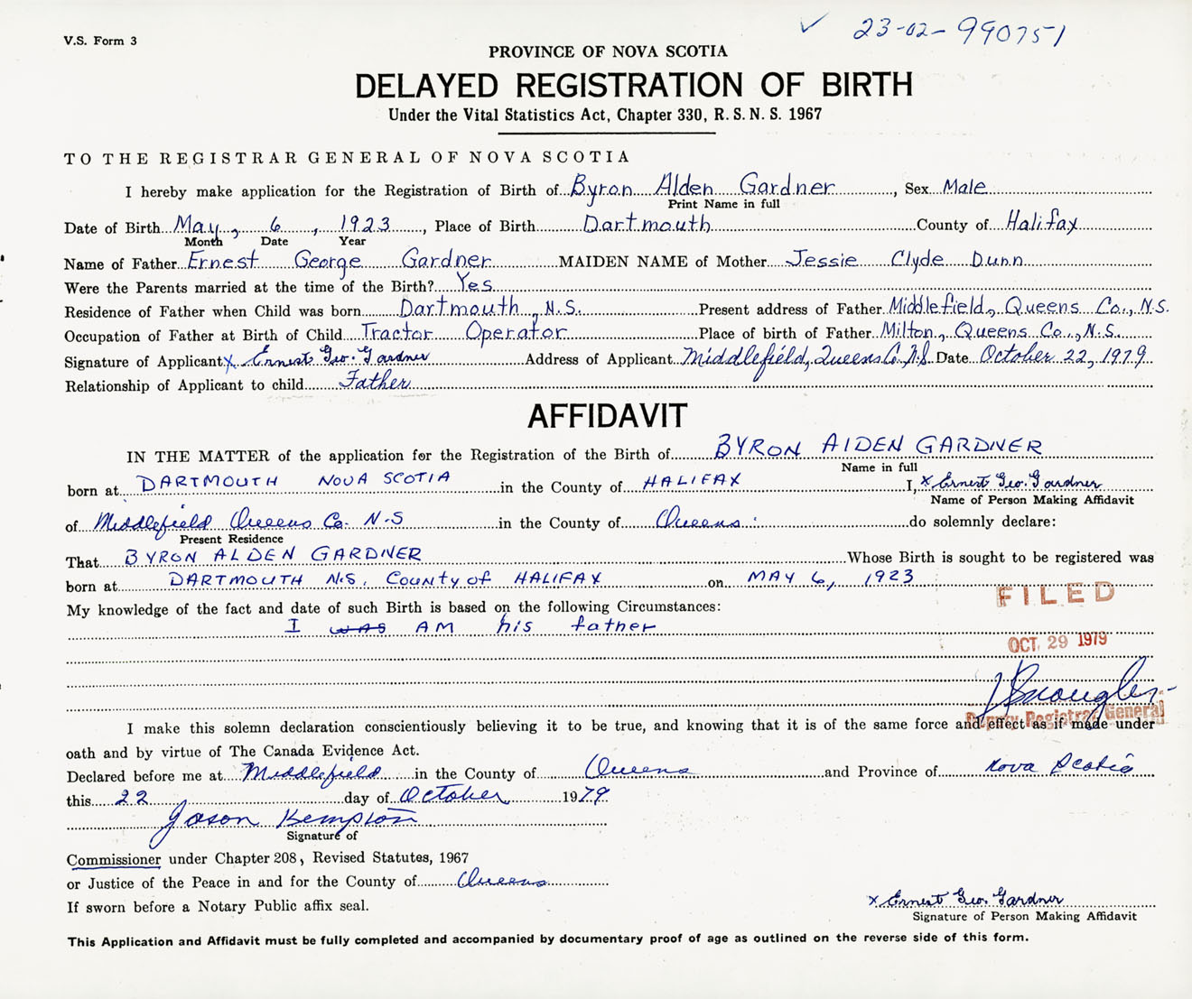 Signature of Applicant Ernest George Gardner Address of Applicant Middlefield, Queens Co., NS Date 22 October 1979