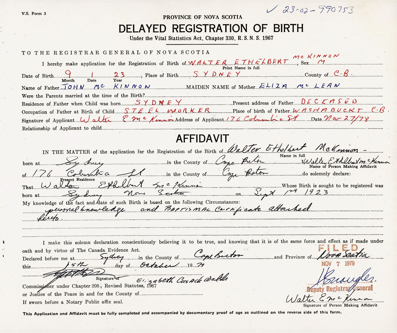 Signature of Applicant Walter E. McKinnon Address of Applicant 176 Columbia Street, Sydney, Cape Breton Co., NS Date 27 November 1978