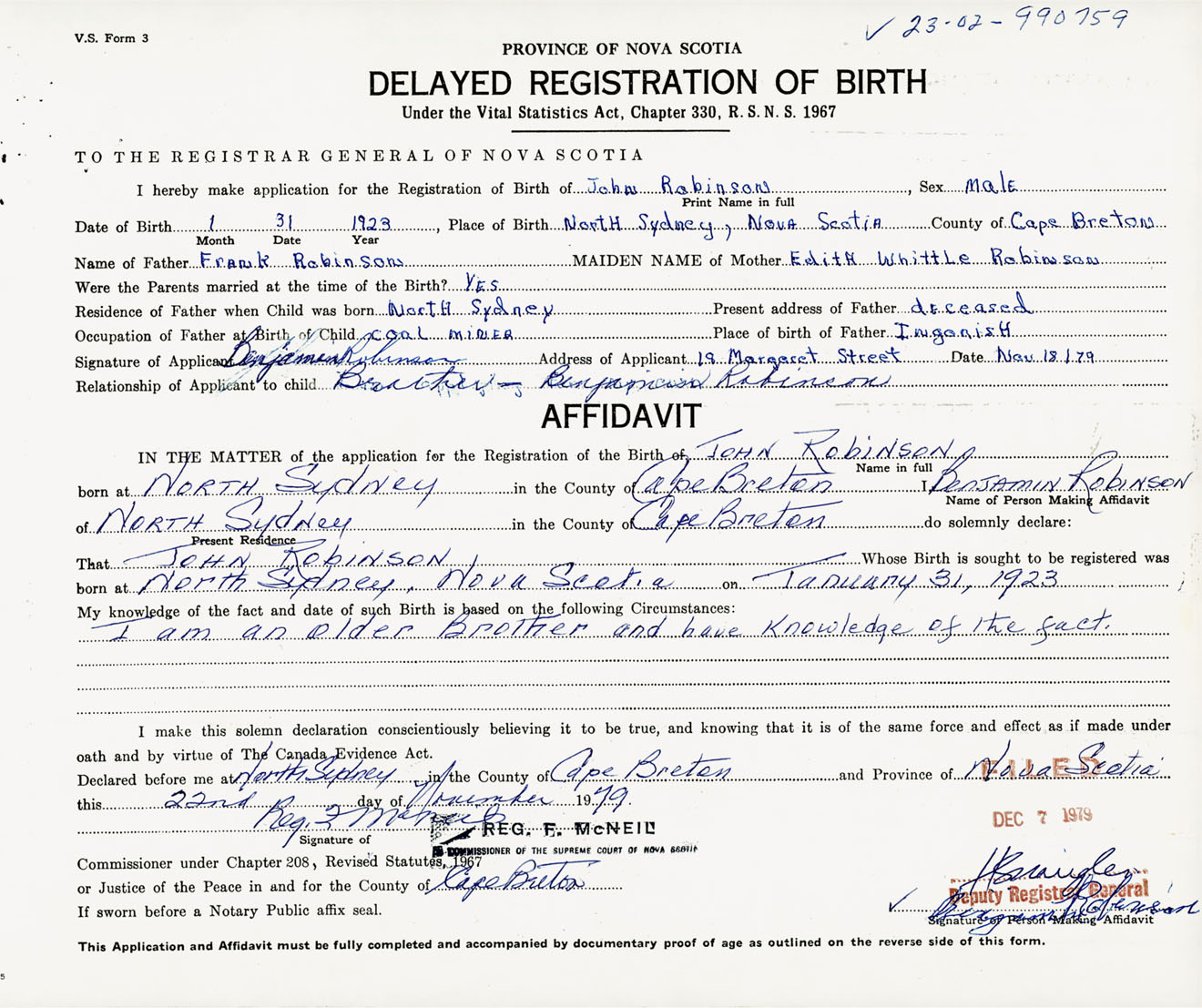 Date of Birth January 31, 1923 Place of Birth North SydneyCounty of Cape Breton