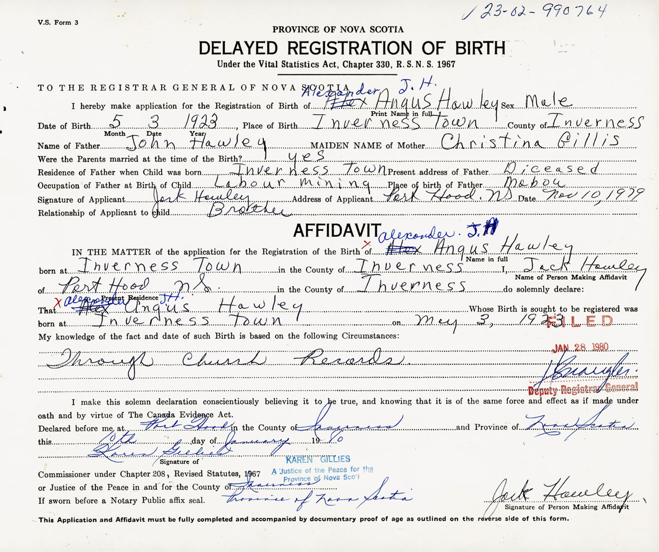 I hereby make application for the Registration of Birth of Alexander AngusHawley Sex Male