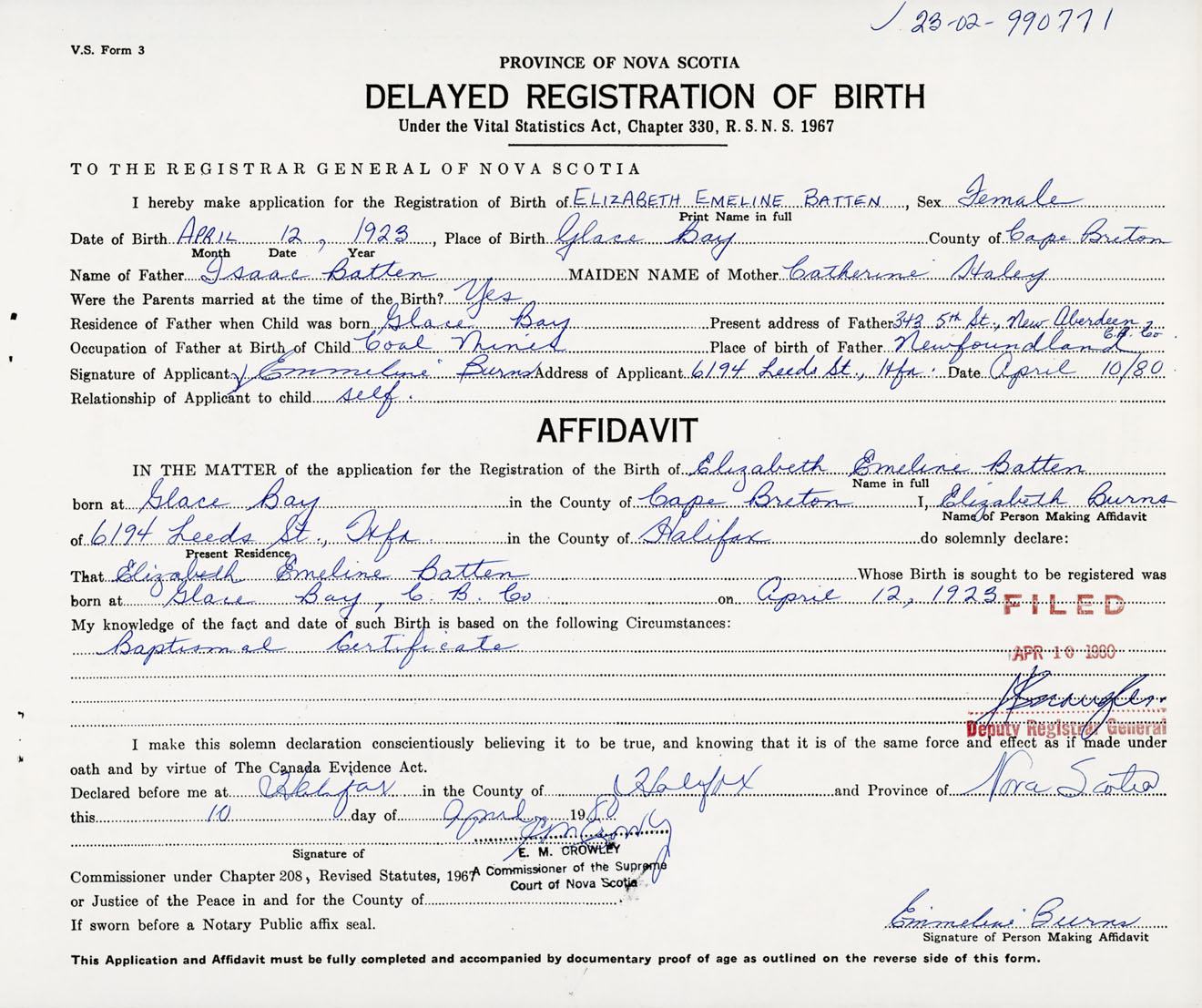Signature of Applicant Emmeline Burns Address of Applicant 6194 Leeds Street, Halifax, NS Date 10 April 1980