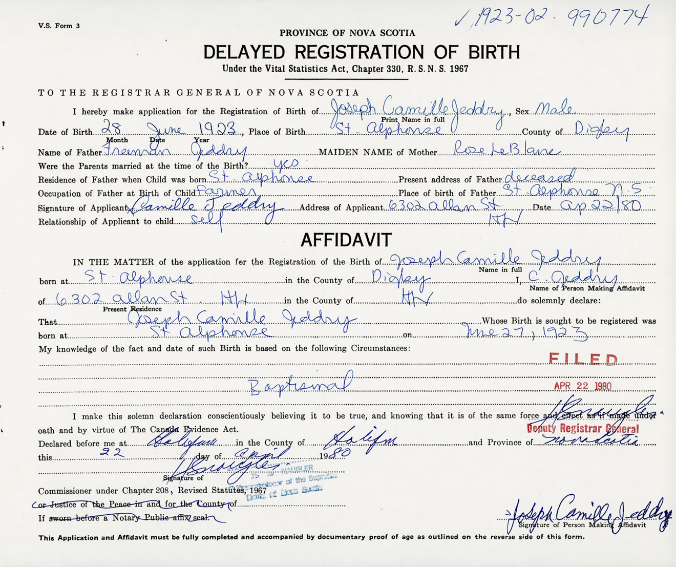Date of Birth June 28, 1923 Place of Birth St. AlphonseCounty of Digby