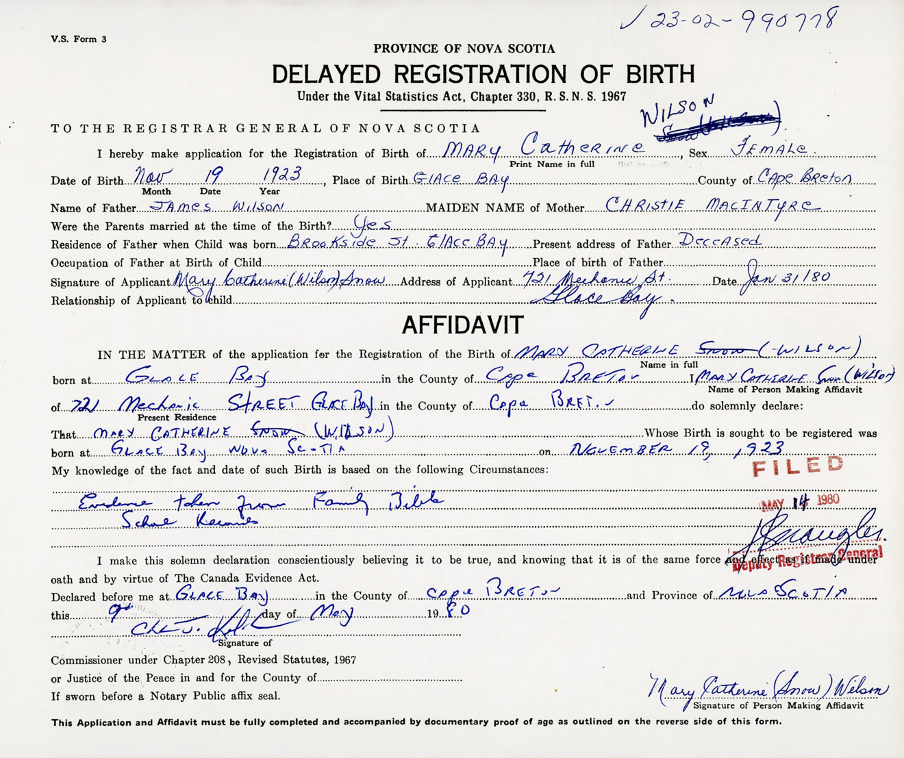 Signature of Applicant Mary Catherine Wilson Snow Address of Applicant 721 Mechanic Street, Glace Bay, Cape Breton Co., NS Date 31 January 1980