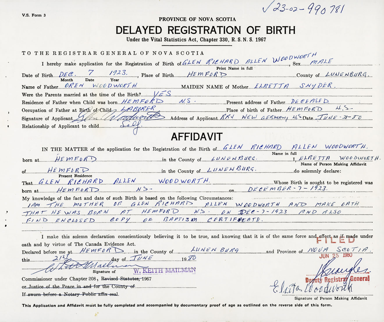 I am the mother of Glen Richard Allen Woodworth and make oath that he was born at Hemford, NS. On December 7, 1923 and also find enclosed copy of baptism certificate.