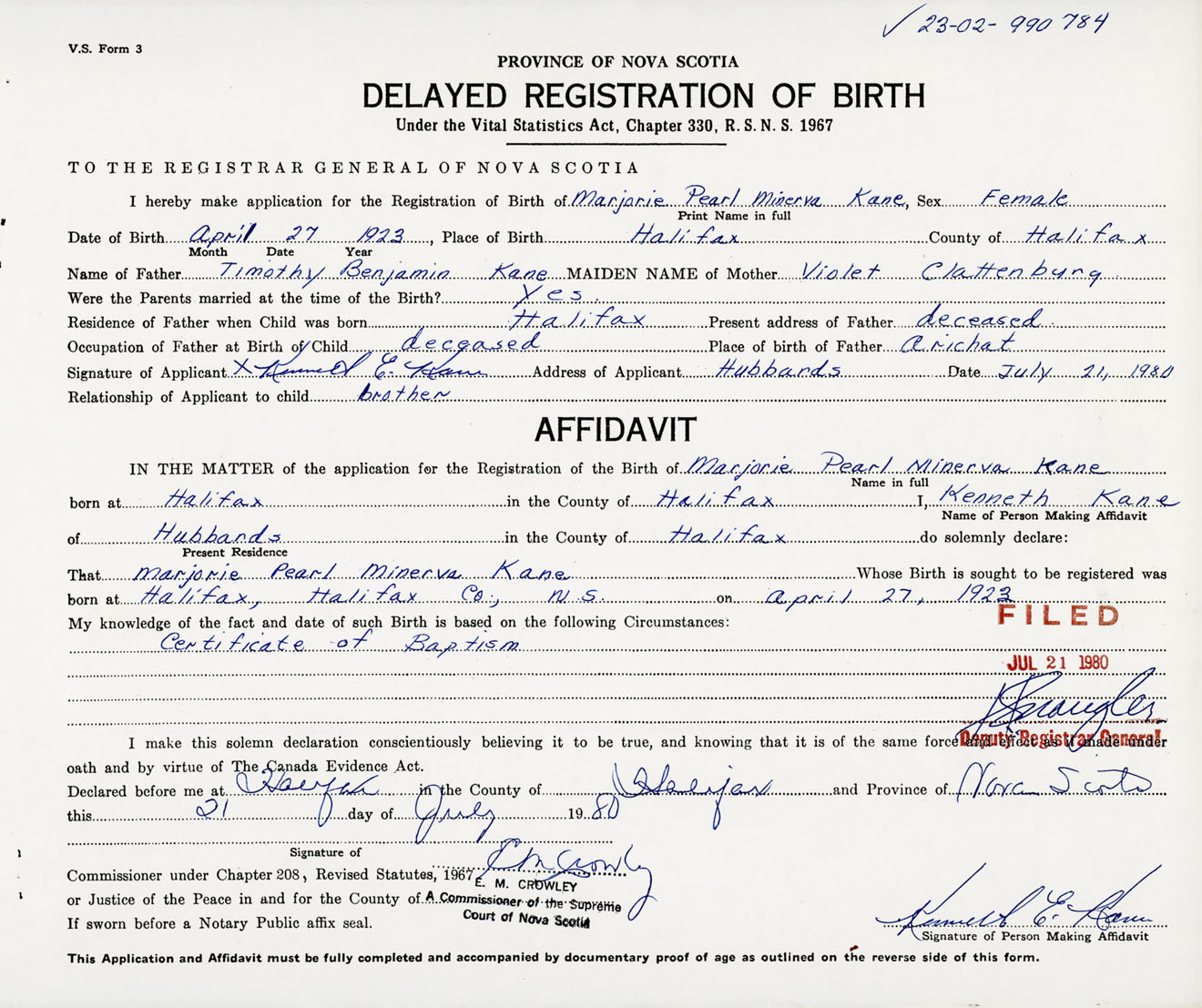 I hereby make application for the Registration of Birth of Marjorie Pearl MinervaKane Sex Female