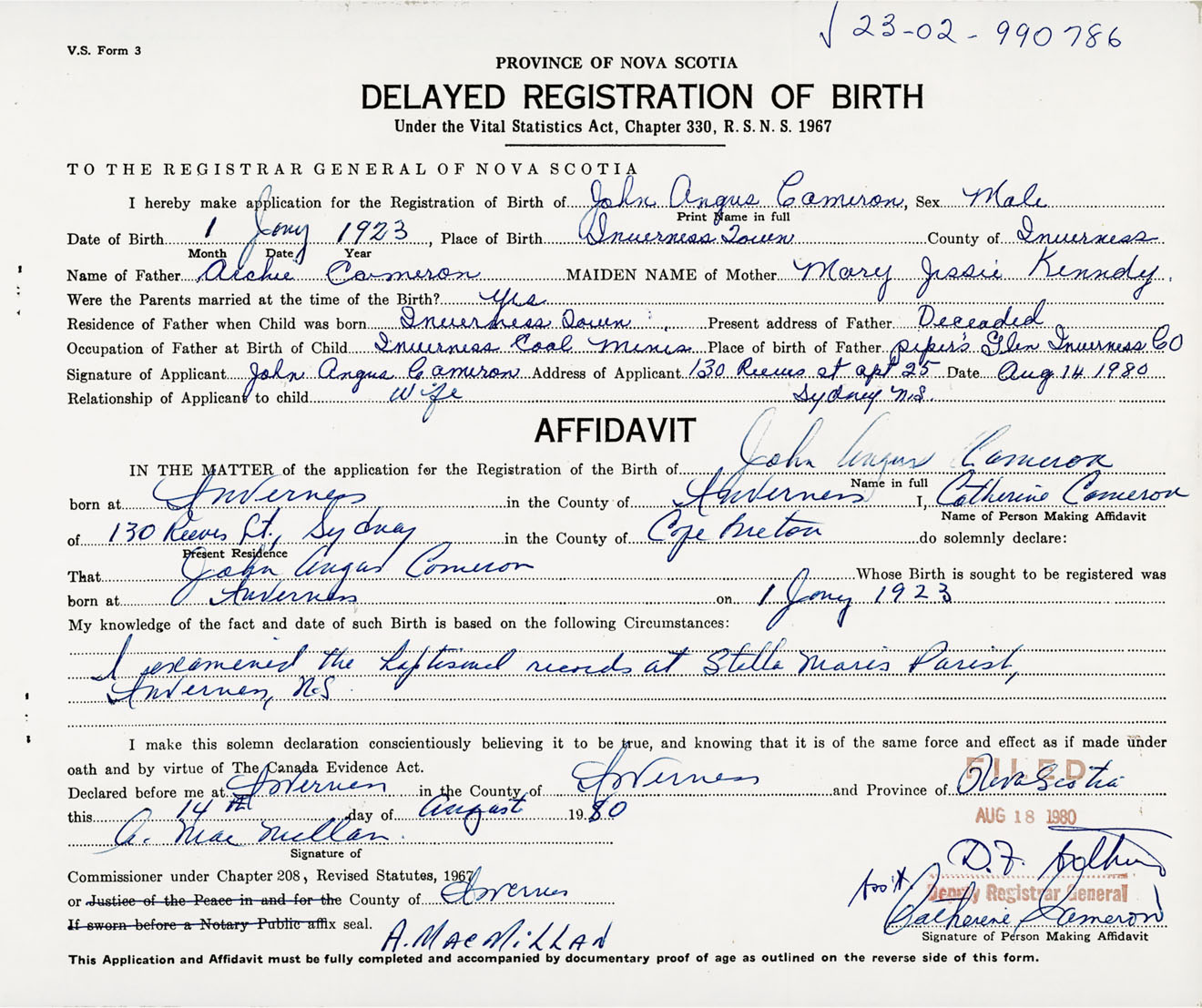 Signature of Applicant John Angus Cameron Address of Applicant 130 Reeves Street, Apt. 25, Sydney, Cape Breton Co., NS Date 14 August 1980