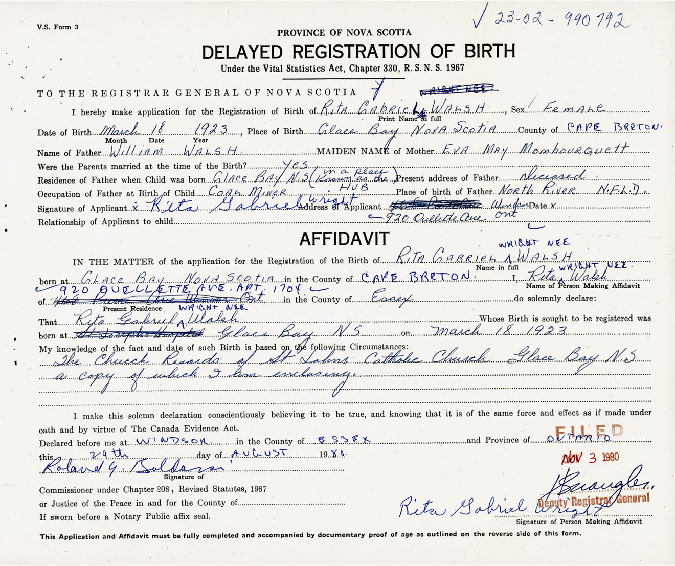 IN THE MATTER of the application for the Registration of the Birth of Rita GabrielWalsh