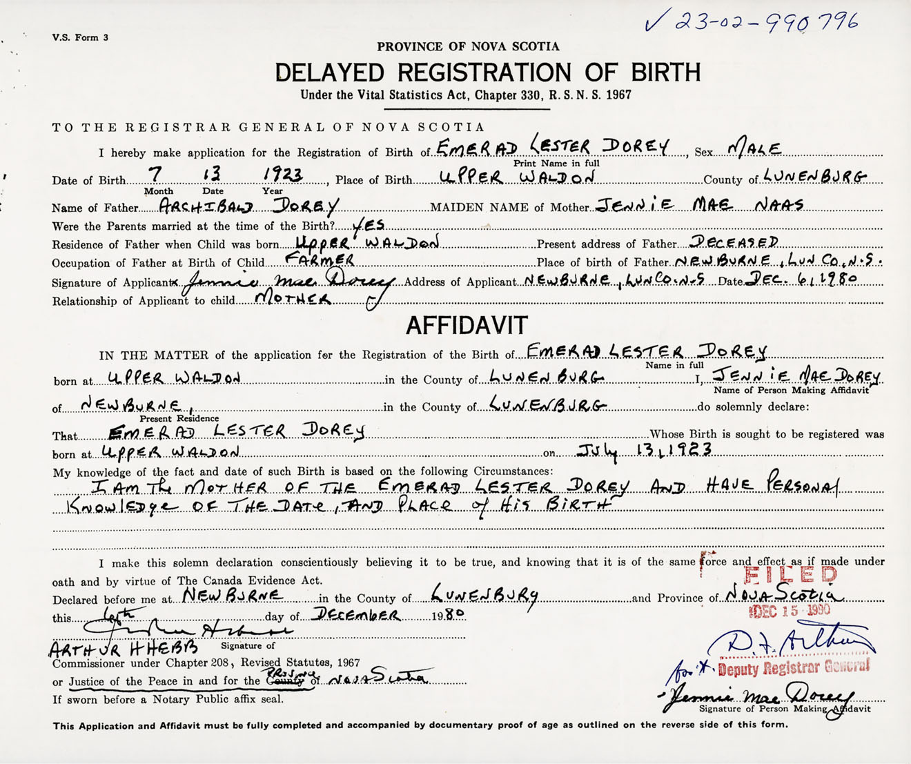 Signature of Applicant Jennie Mae Dorey Address of Applicant Newburne, Lunenburg Co., NS Date 6 December 1980
