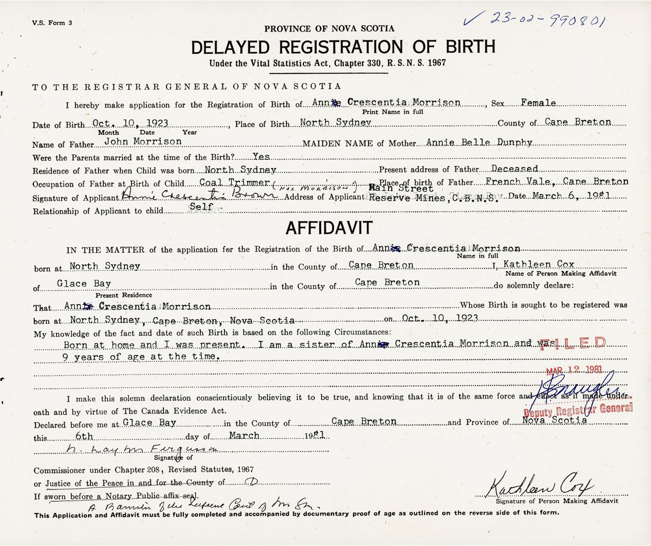 Signature of Applicant Annie Crescentia Brown Nee Morrison Address of Applicant Reserve Mines, Cape Breton Co., NS Date 6 March 1981