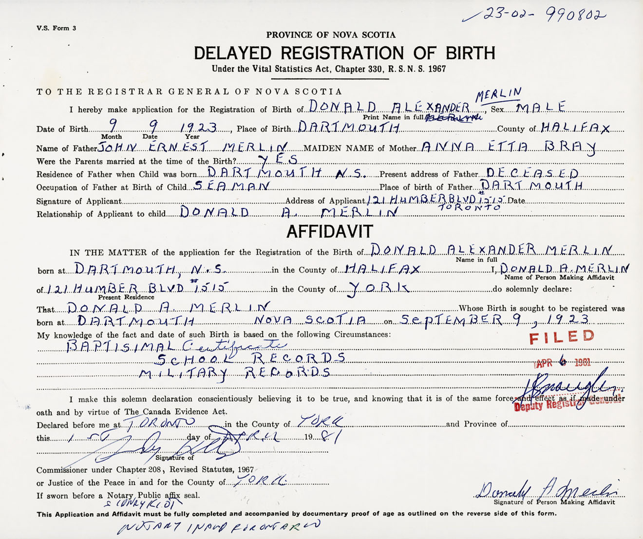 I hereby make application for the Registration of Birth of Donald AlexanderMerlin Sex Male