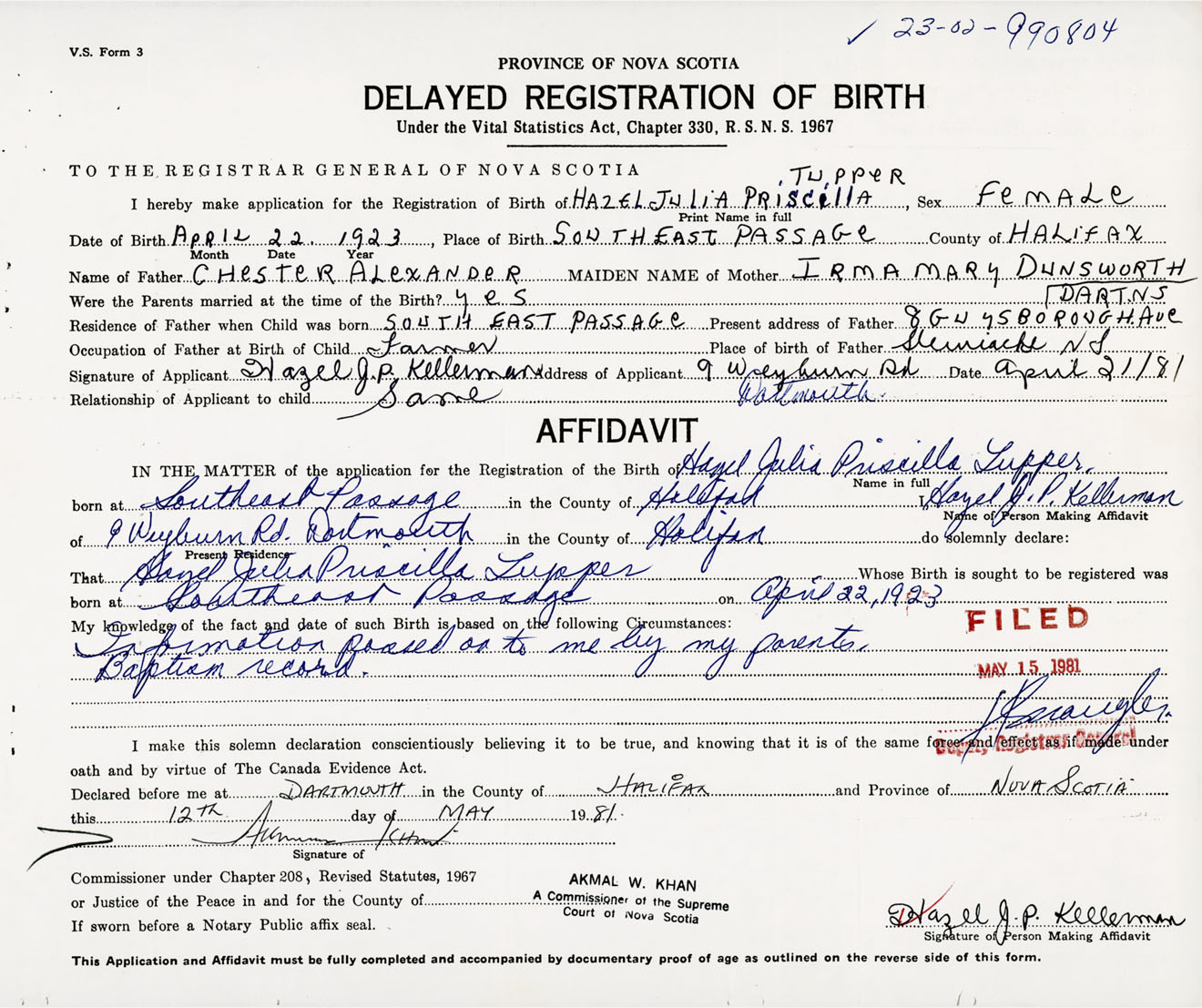 Signature of Applicant Hazel J. P. Kellerman Address of Applicant 9 Weyburn Street, Dartmouth, NS Date 21 April 1981