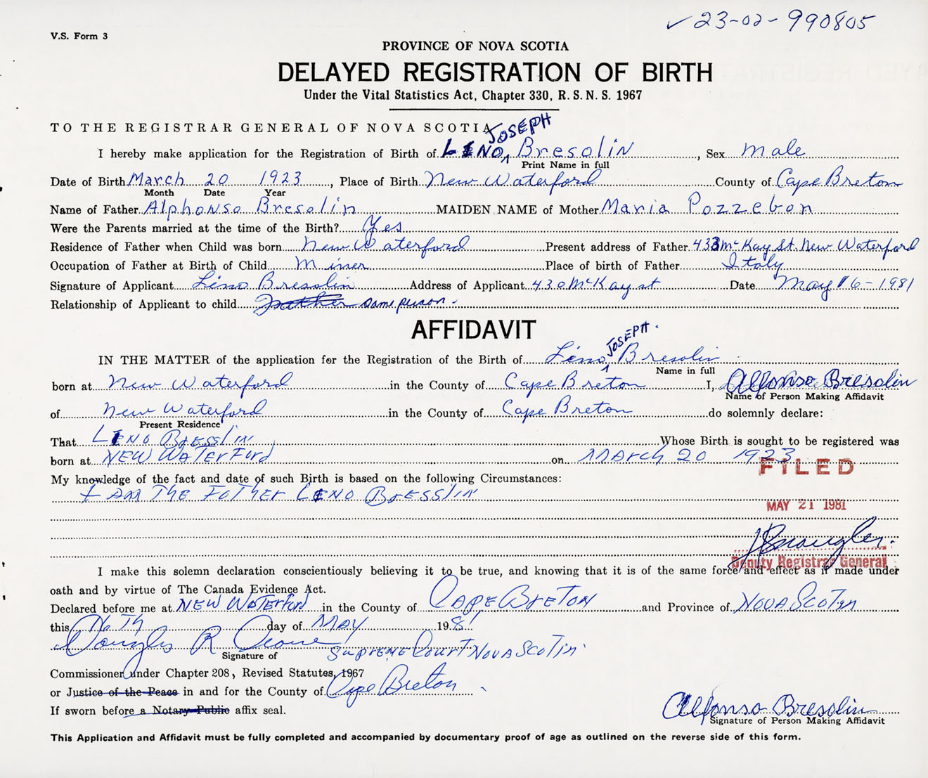 Signature of Applicant Lino Bresolin Address of Applicant 433 McKay Street, New Waterford, Cape Breton Co., NS Date 16 May 1981